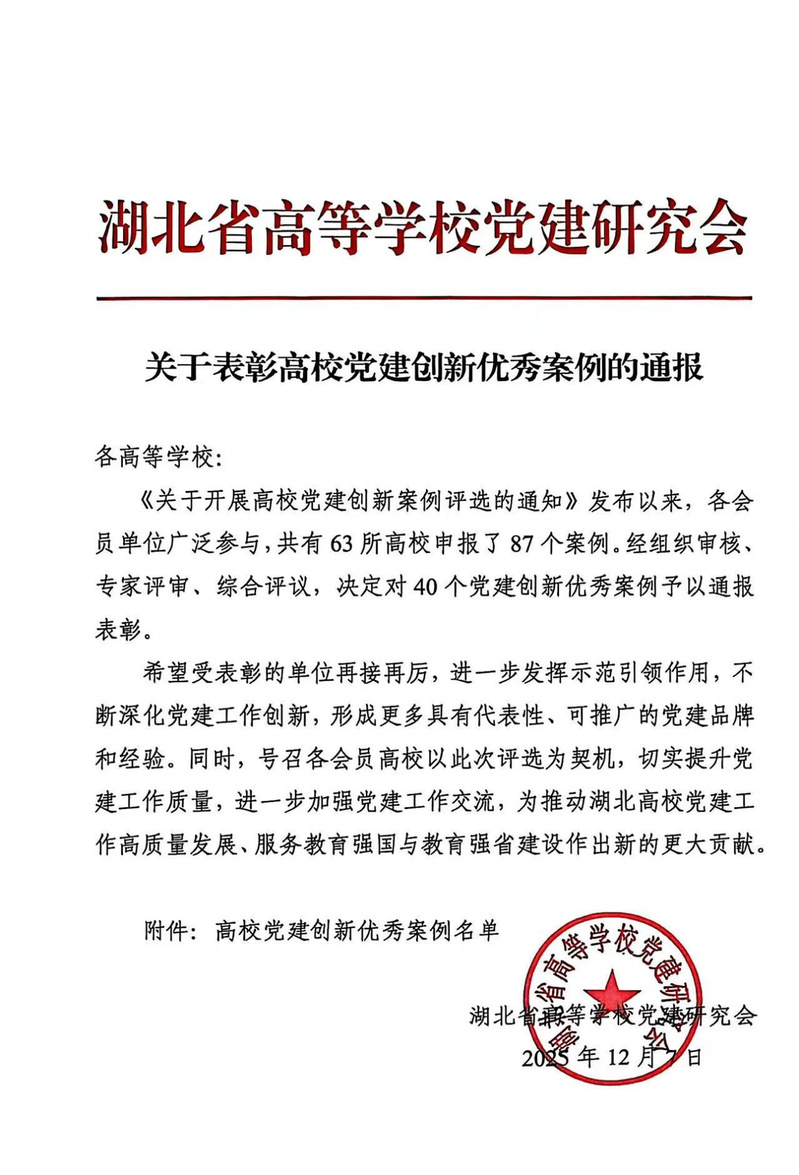 近日,湖北省高等学校党建研究会公布高校党建创新优秀案例名单,全省有63所高校87个案例申报,最终评选了40...